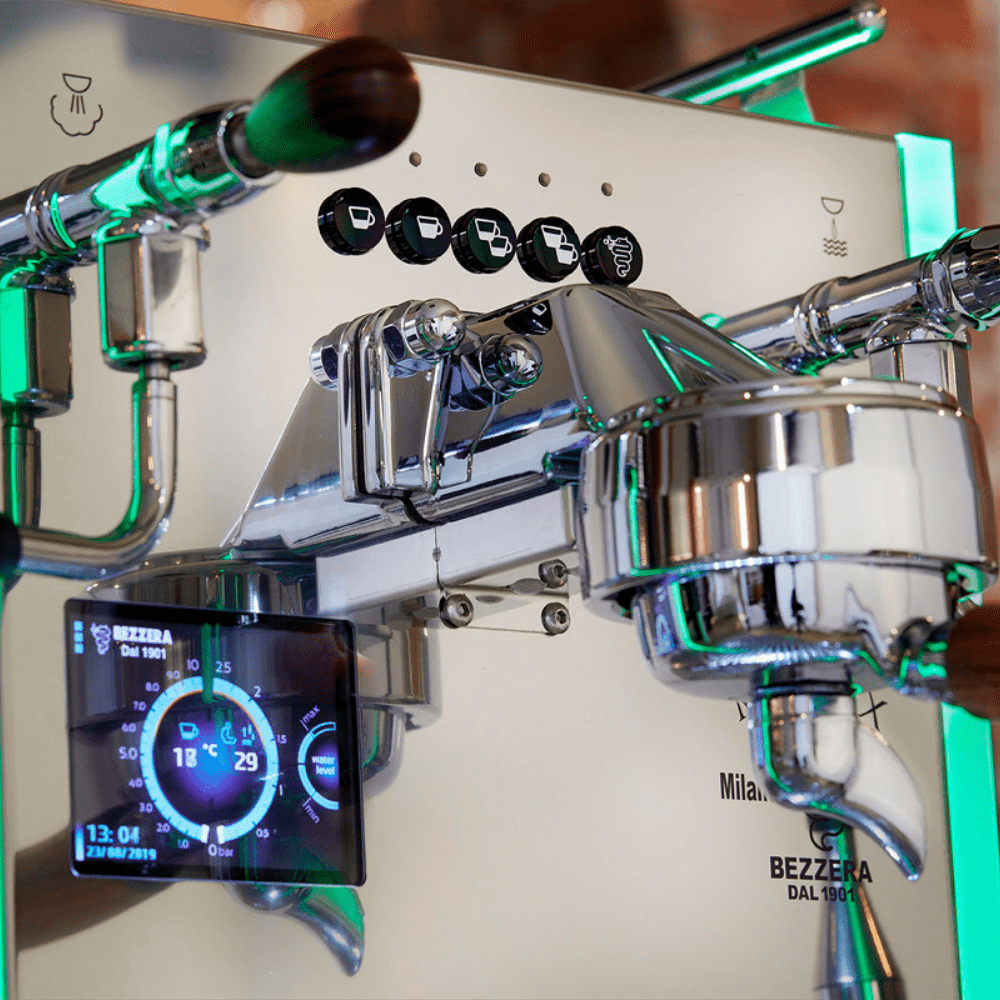 The Matrix model represents innovation in the world of semi-automatic espresso coffee machines. It combines traditional “LEVER” technology with sophisticated software and electronics that allow, through a 3.5″ touch display, control over the double water heater system and the selection of body colours according to the style of the environment, also available in the DE version with 3 thermostats and volumetric dispensing.