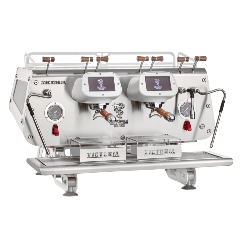 Victoria’s multi-boiler technology is engineered for intensive use, offering precise control of temperature and pressure through programmable brewing profiles that enhance both single origins and complex blends. The machine features independent boilers with dedicated on/off switches — two for steam and hot water, and one coffee boiler for each group — ensuring maximum productivity at all times. A dedicated program also allows the two steam boilers to be combined to create a continuous steam supply, essential during peak service.