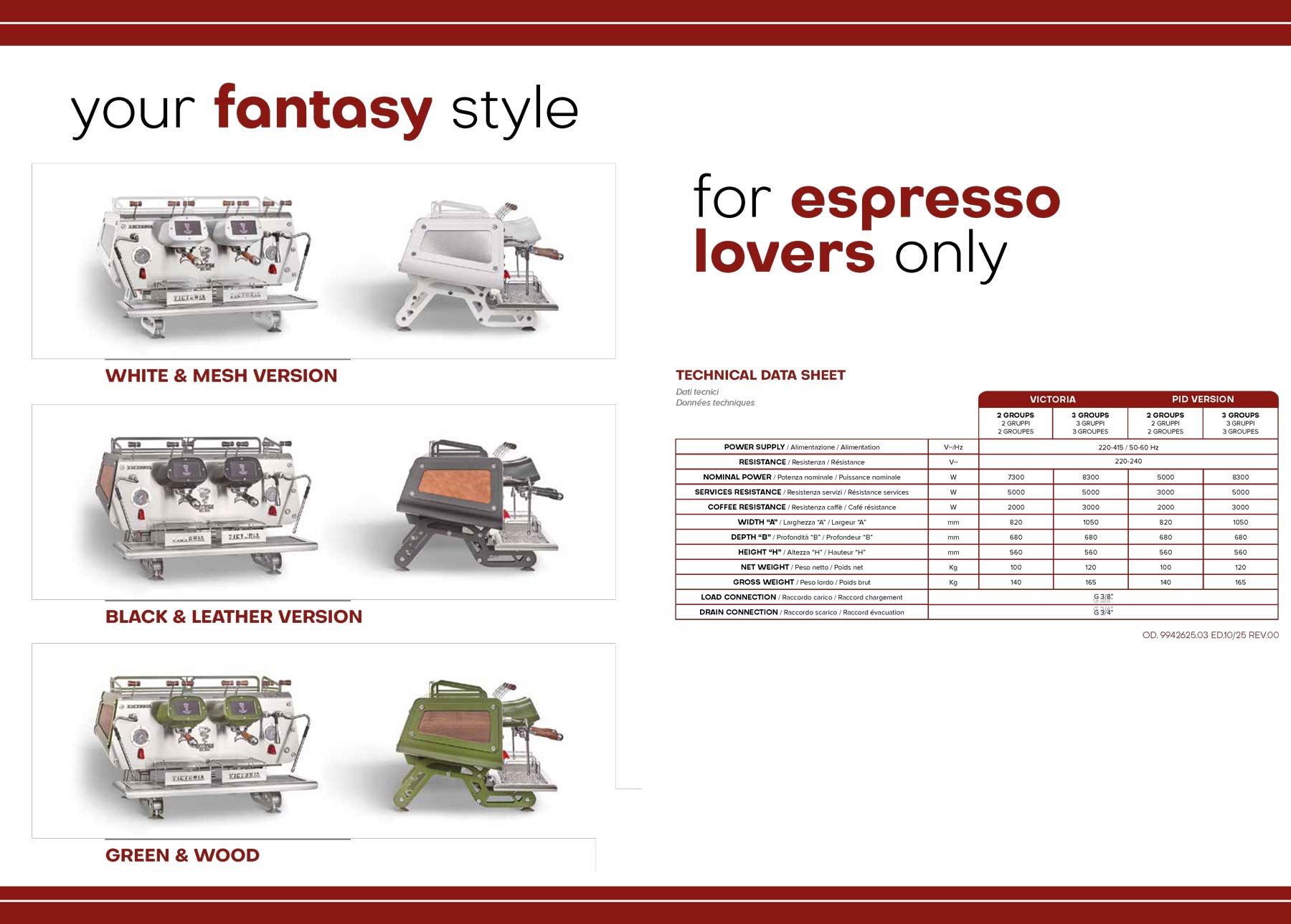 Victoria’s multi-boiler technology is engineered for intensive use, offering precise control of temperature and pressure through programmable brewing profiles that enhance both single origins and complex blends. The machine features independent boilers with dedicated on/off switches — two for steam and hot water, and one coffee boiler for each group — ensuring maximum productivity at all times. A dedicated program also allows the two steam boilers to be combined to create a continuous steam supply, essential during peak service.
